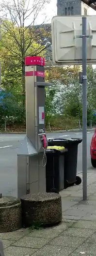 ![]() Eine neu aufgestellte Telestation Langversion ohne Dach/Seitenscheibe. Der Aufkleber im oberen Bereich der Säule zeigt an, dass es hier einen WLAN-Hotspot gibt. Manchmal fehlt dieser Aufkleber aber auch und es gibt trotzdem WLAN. ![]() Es kann auch so ein kleiner Kasten links daneben stehen... |