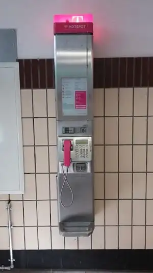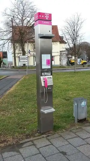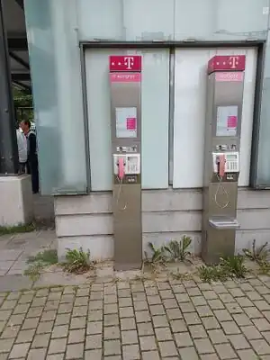 ![]() Eine Telefonsäule des Typs Telestation Wandversion. ![]() Weitere Telestation Wandversion. Der Aufkleber im oberen Bereich der Säule zeigt an, dass es hier einen WLAN-Hotspot gibt. Bei diesen Telefonsäulen fehlt der Aufkleber aber häufiger mal und es gibt trotzdem WLAN. |