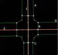Wenn du dieses Beispiel mit Relationen nutzen möchtest, solltest du eine Relation mit "1" als Strasse und den vertikalen Gehsteigen als Mitglieder mit der Rolle "sidewalk" nutzen. In diesem Falle sind alle Kreuzungen der Kreuzung Mitglied beider Strasse, weshalb sie — ebenfalls in der Rolle "sidewalk" — hinzugefügt werden sollten. Die Kurvenstücke, die die Fusswege der beiden Strassen verbinden, sollten separiert werden und der Relation ebenfalls hinzugefügt werden, da sie zu beiden Strassen gehören. Selbiges kann auch auf Straße "2" angewendet werden, wobei dort die horizontalen die zugehörigen Gehwege sind. Achtung: Es könnte ein Fehler in diesem Beispiel enthalten sein! Wenn die Bordsteinkante anstelle von kerb=flush mit kerb=raised, was wheelschair=no impliziert, gekennzeichnet ist, meint dies, dass ein Rollstuhlnavigationssystem nicht in der Lage sein könnte, den Nutzer entlang des Boardsteigs zu leiten (also z.B. von links nach oben, nicht die Strasse kreuzend). Stattdessen sollte der kerb=*-Schlüssel nicht den durchgehenden Weg unterbrechen, also inmitten des von der Strasse auf den Bordstein führenden verbindenden Weges befnidlich sein. Ein neues Beispiel ist laut User:Joshdoe bereits seit June 2011 in Planung. |