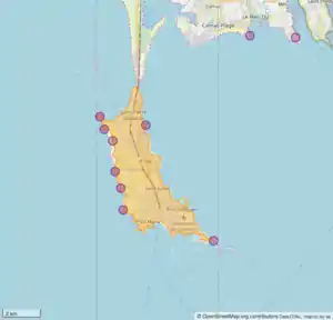 Das Tag natural=peninsula wird verwendet, um benannte Halbinseln (aus dem Lateinischen paeninsula, von paene "fast" + insula "Insel") zu markieren: ein Stück Land, das aus einer größeren Landmasse ins Wasser ragt und fast vollständig von Wasser umgeben ist.
