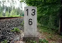 Die Kilometerangabe kann auf einem Stein oder Schild am Oberleitungsmast ausgeführt sein.