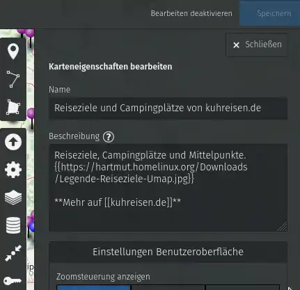 Jetzt sehen Sie den Namen der Karte und darunter die Beschreibung. Füllen Sie beides aus wie im Beispiel. Das Bild wird verlinkt mit der URL eingefasst mit doppelten geschweiften Klammern. Im Zweifelsfall finden Sie unter dem ? die Hilfe dazu. Hier kann man auch prima Infos zum Kartenersteller unterbringen.