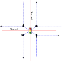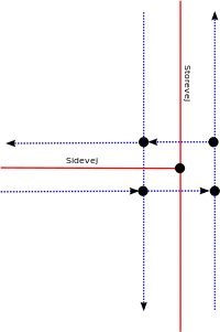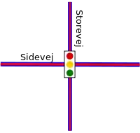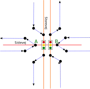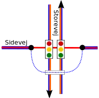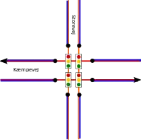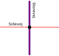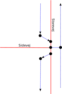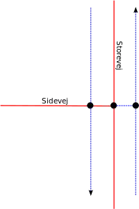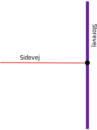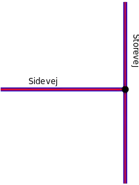 ![]() Figur 2b. Simpelt T-kryds, med topologi som typisk ses i byer. |