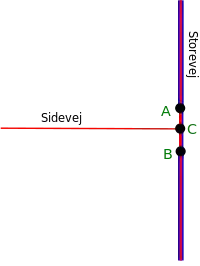 Hvis cykelstien ophører i omegnen af krydset med Sidevej, som vi så i Figur 2, kan man afbilde situationen som i Figur 10b. Her indsættes it lille stykke vej A-B med cykelsti i kun den ene side. Dette stykke kunne tagges: