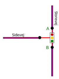 Nu er situationen blevet lidt mere kompliceret, for i dette T-kryds er der et trafiklys. Vi ønsker stadigvæk at forbinde den nordgående cykelsti med Sidevej, men skal nu gennem et trafiklys. Den øverste lille skrå pil på Figur 3a angiver et lille ensrettet stykke som benyttes af cyklister som kommer kørende fra syd ad Storevej og skal til venstre ad Sidevej. Den nederste skrå pil benyttes af cyklister som kommer fra Sidevej og skal dreje til venstre ad Storevej.