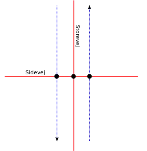 For at illustrere dette tegnes Storevej med blå kanter i begge sider. Sidevej er f.ex. tagget som