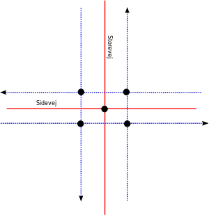 Figur 4 viser den mest simple konfiguration hvor en vej med modsatrettede, ensrettede cykelstier krydses af en mindre vej uden cykelstier. Masser af kryds er tegnet som dette i OSM, men som vi så med T-krydset i Figur 2, afspejler det næppe de givne forhold. Topografien strengt taget kun korrekt såfremt cykelstierne langs Storevej krydser Sidevej i et separat kryds uden forbindelse til selve krydset mellem Storevej og Sidevej.