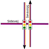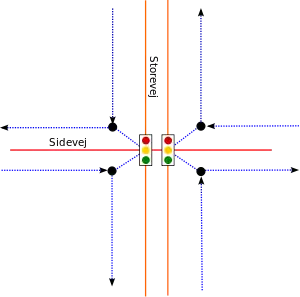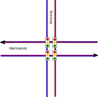 ![]() Figur 6a. Vejkryds med cykelstier i alle retninger, samt trafiklys. |