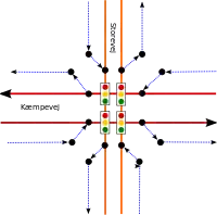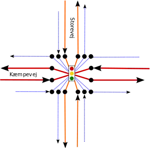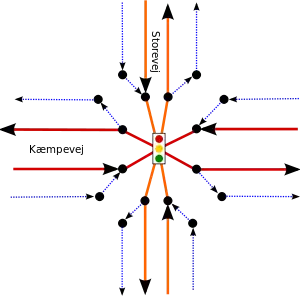 ![]() Figur 9a. Vejkryds mellem to dobbeltsporede veje, med cykelstier i alle retninger, med et enkelt trafiklys. Af pladshensyn er der ikke tegnet pile på forbindelserne til det centrale knudepunkt. |