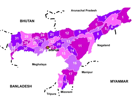 - in Lower Assam: 23. Kamrup Metropolitan, 24. Baksa#, 25. Nalbari, 26. Kamrup, 27. Barpeta, 28. Chirang#, 29. Bongaigaon, 30. Goalpara, 31. Kokrajhar#, 32. Dhubri, 33. South Salmara-Mankachar;