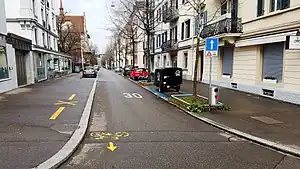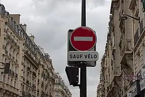 Le double-sens cyclable doit obligatoirement être signalé par le panonceau M9v2 (sauf vélo) apposé sous le panneau sens interdit. Un marquage au sol peut être rajouté pour aider la visualisation du chemin cyclable.