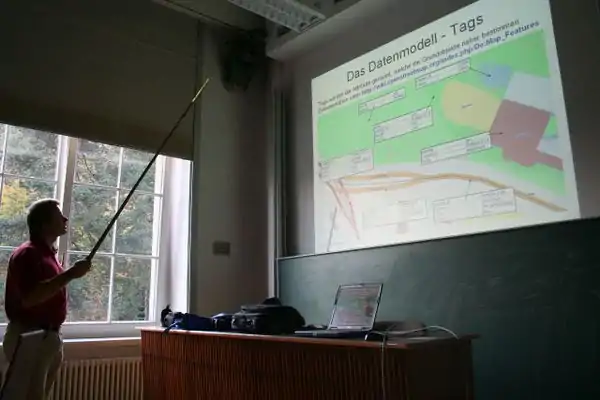 Zum Vortrag ab 10:00 waren ca. 40 Teilnehmer erschienen. Die aufgeworfenen Fragen liessen breites Interesse, gleichzeitig aber auch die Weitlaeufigkeit des Themas erkennen. Beispielsweise wurde die Frage diskutiert, ob man alle Wege erfassen soll, auch wenn dies eventuell dem Naturschutz schadet oder privates Recht eine Rolle spielen kann. Bei den anschliessenden Wanderungen wurden reichlich GPS-Daten gesammelt. Im Hoersaal am Projektor und in kleineren Gruppen im Seminarraum wurde am spaeten Nachmittag dann fleissig editiert und erklaert. Besonderen Dank an die UNI in Tharandt, fuer die Bereitstellung der perfekten Infrastruktur inklusive Projektor und superschnellem Internet.