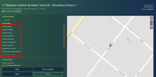 MapRoulette es un sistema de asignación de tareas. Cuando ingresamos a alguno de los desafíos del mapatón, vamos a ver un mapa con los puntos a cargar a la izquierda, una serie de datos a la derecha y un botón de Comenzar abajo a la derecha. Al presionar en Comenzar nos asignará una tarea al azar dentro del desafío.