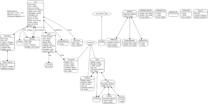 La base de datos contiene tablas para cada tipo de Elemento (nodos, caminos, relaciones). De hecho, para cada uno de ellos hay varias tablas: current, history, current_tags, history_tags (actual, historial, etiquetas_actuales, etiquetas_historial). Además, hay tablas para el almacenamiento de conjuntos de cambios, archivos gpx (gpx_files), usuarios, entradas del diario, sesiones, oauth, etc.