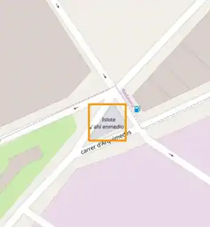 • una vía cerrada a lo largo de los contornos de la calle, donde esta se une a los edificios a ambos lados de la misma, etiquetada con area:highway=pedestrian;