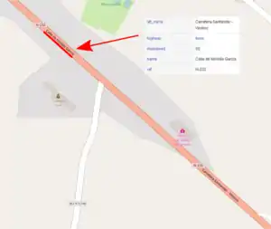 En el caso de que un tramo de carretera transcurra por una área urbana este debe llevar la denominación de la calle en la etiqueta name mientras que el nombre oficial de la vía pasa a alt_name. En la siguiente imagen la carretera con denominación "Carretera Santander-Vinaroz" en la etiqueta name cambia a "Calle de Nicolás García" a su paso por la localidad de Soncillo. Para no perder el nombre de toda la carretera se traslada "Carretera Santander-Vinaroz" a alt_name.
