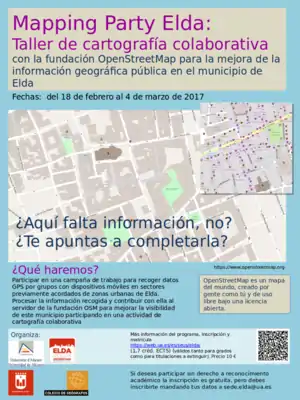 Convocamos a todos los mappers, usuarios de OSM y en general a todos los aficionados a la cartografía, y sobre todo a los ciudadanos de Elda, que serán los beneficiarios de la misma, a esta cita. Conforme vayamos teniendo más datos se publicarán en esta wiki.