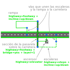 Unas escaleras se mapean como una vía con la etiqueta highway=steps, un ascensor es un nodo con la etiqueta highway=elevator. Una rampa es un highway=footway que contiene la etiqueta incline=*. Estos objetos deben estar conectados en su parte superior y en su parte inferior a las vías compartidas y diferenciadas que unen.