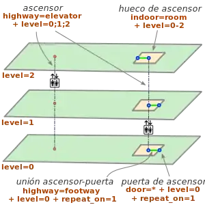 Un ascensor o elevador se define mediante un nodo etiquetado como highway=elevator, en el que la etiqueta level=* describe los niveles de servicio, tanto en forma de lista de valores (p. ej., level=1;2;4) como en intervalo (p. ej., level =-1-4). Se define una unión geométrica entre el nodo del ascensor y las áreas peatonales que lo rodean y comparten el mismo level=*.
