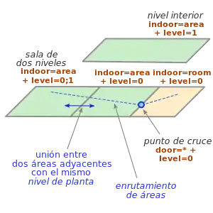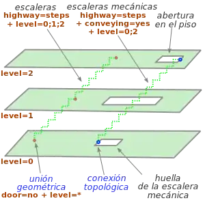 Una vía interior debe contener la etiqueta level=* para definir la planta donde se encuentra. Un cambio de nivel se describe mediante un valor múltiple de level=* (p. ej., level=1;2) en escaleras highway=steps, en un ascensor highway=elevator o en una rampa highway=footway + incline=*.