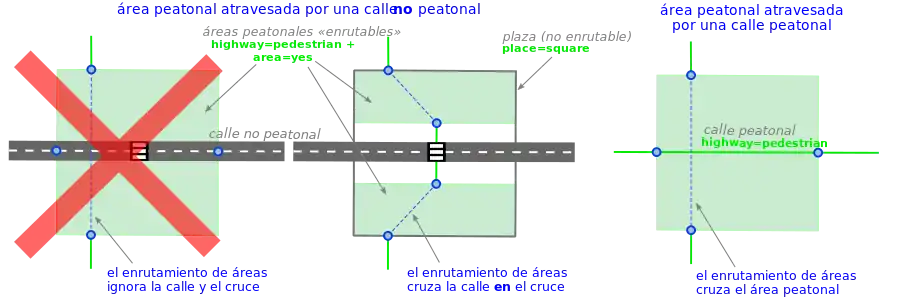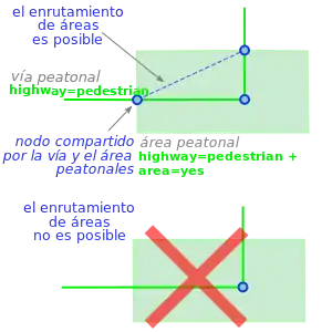 Nota: las áreas con la clave area:highway=*, usadas para describir la forma de carreteras y aceras, no están destinadas a ser usadas para enrutamiento.