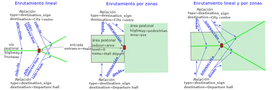 El diagrama Aplicación de una relación «destination_sign» a navegación peatonal muestra cómo las relaciones «destination_sign» se pueden definir para enrutamiento lineal o enrutamiento por zonas, así como para ambos combinados a la vez.
