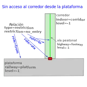 Ten en cuenta que los miembros from y to pueden ser áreas peatonales (una plataforma, un pasillo interior, una zona peatonal, etc.). También varios miembros pueden tener el mismo rol, incluyendo los miembros intersection, por ejemplo, si una entrada se mapea con varias puertas adyacentes.