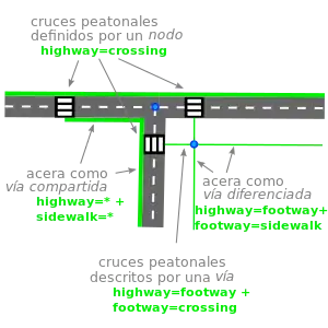 Un cruce peatonal se define por un nodo etiquetado con highway=crossing compartido con la vía que define la calzada. Además, puede ser descrito por una vía highway=footway + footway=crossing que une una o varias vías diferenciadas. Los cruces compartidos con ciclistas se describen en la página footway=crossing.