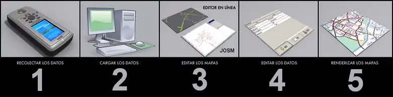 Los datos de OpenStreetMap pueden ser recopilados de muchas maneras. Las carreteras y calles, pueden ser mapeadas a través del trazado de imágenes aéreas (varias organizaciones le proporcionan imágenes a OSM) o utilizando unidades GPS para registrar las rutas.