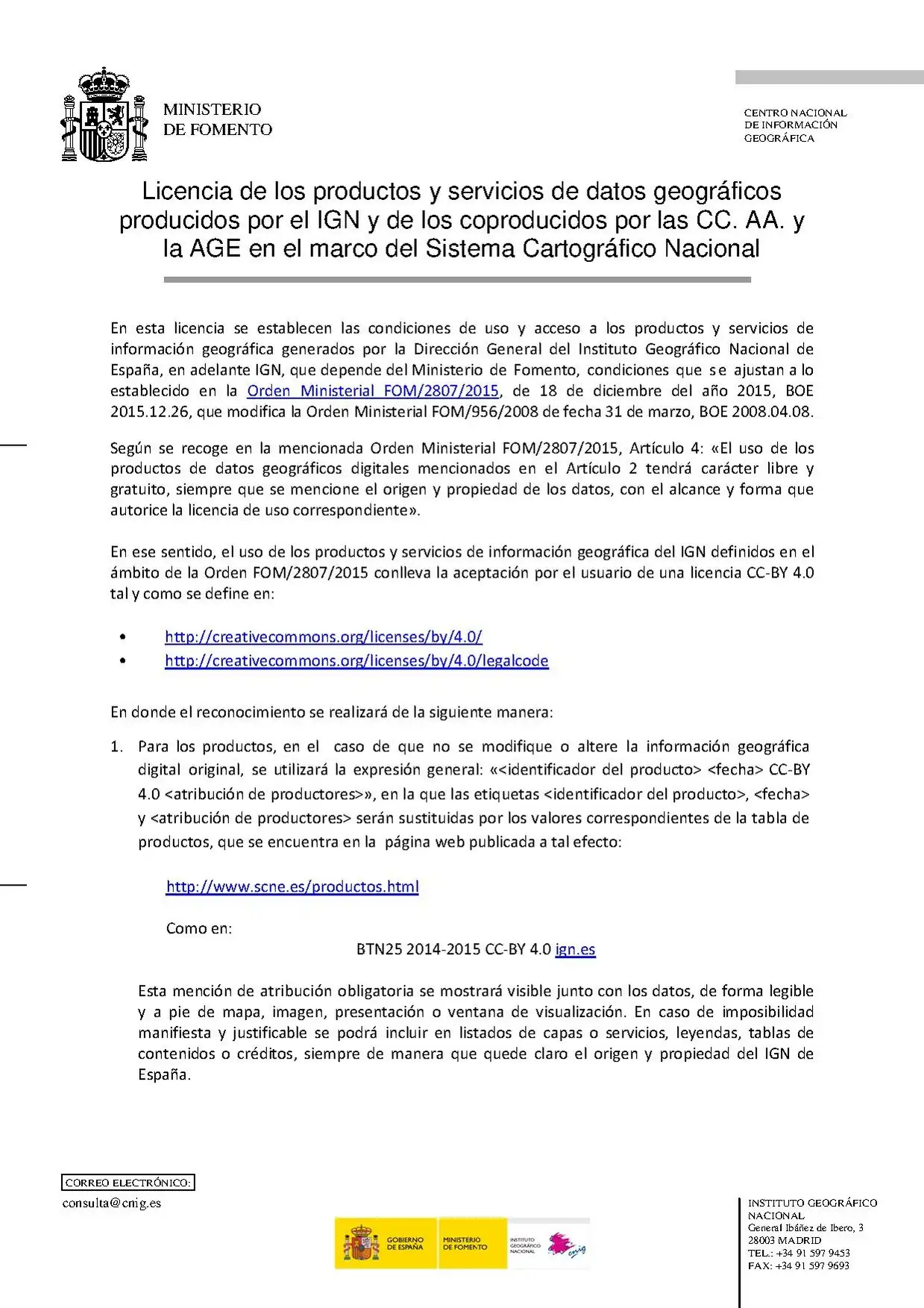 El pasado 18 de Diciembre de 2015, se publicaba la Orden FOM/2807/2015, por la que se aprueba la política de difusión pública de la información geográfica generada por la Dirección General del Instituto Geográfico Nacional. Dicha Orden, establece una licencia para la mayoría de los datos, susceptible de uso en OpenStreetMap, que textualmente "....ampara el uso libre y gratuito para cualquier propósito legítimo, siendo la única estricta obligación la de reconocer y mencionar el origen y propiedad de los productos y servicios de información geográfica licenciados como del IGN....".