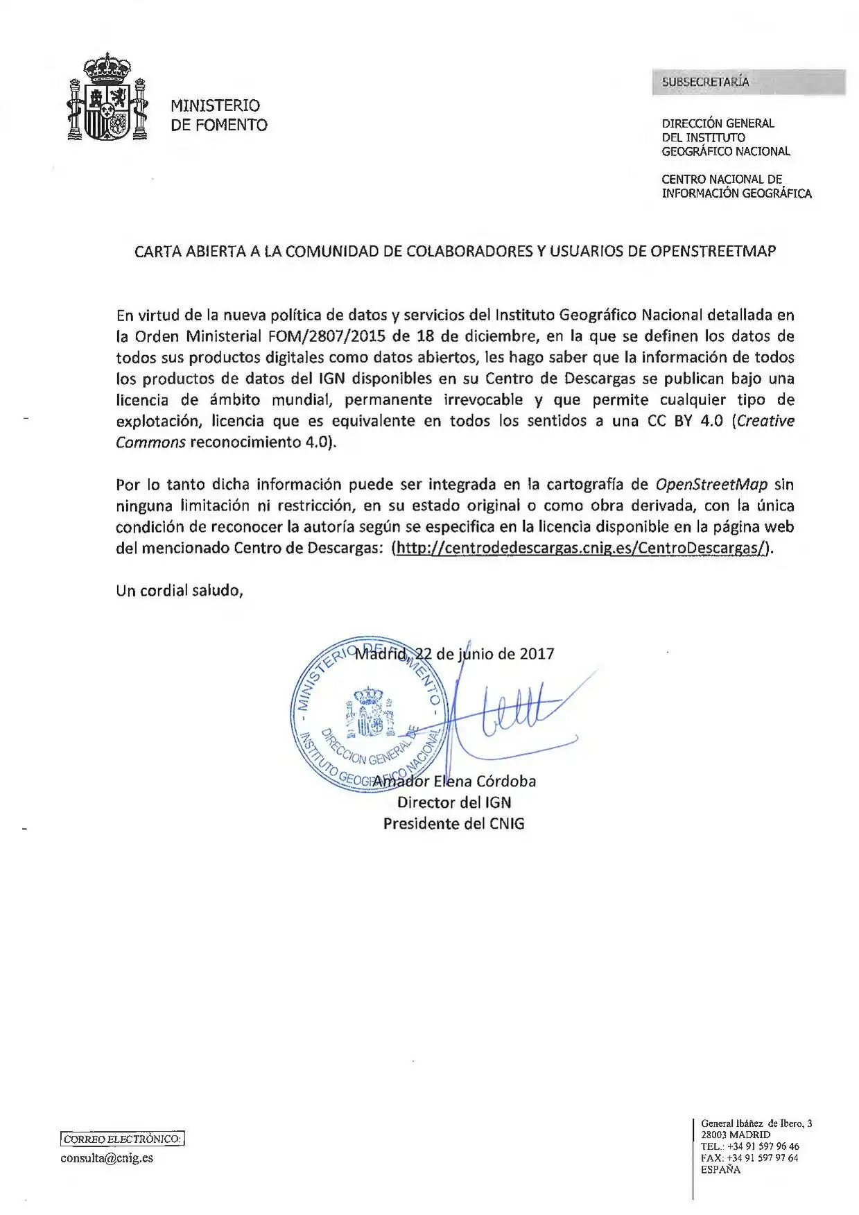 En esta carta enviada a la OSM Fundation, el IGN autoriza expresamente a OSM al uso de los productos bajo licencia CC BY 4.0