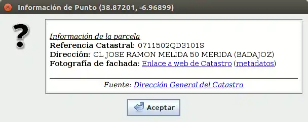 Este módulo hace uso del servicio web Consulta RCOORD del Catastro Español descrito en este documento. A partir de las coordenadas del punto se muestra la referencia catastral de la parcela, la dirección postal y enlaces a la fotografía de fachada y a los metadatos de la misma (para comprobar la fecha de adquisición). Si usas las fotos de fachada, añade source=Dirección General de Catastro al conjunto de cambios.