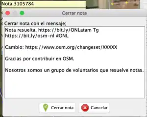 Para tener una leve interacción con el usuario, se deja un mensaje al cerrar la nota el cual refleja la actividad coordinada que se está haciendo. Las notathones son parte de la actividad coordinada: ES:LatAm/Proyectos/Resolución de notas que busca cerrar las notas de toda LatAm. En dicho mensaje se le comunica que la nota fue procesada, se incluye una página para mayores detalles y se usa un hashtag que identifica nuestra actividad: #ONL. En algunos casos se asocia el número de changeset donde se resolvió la nota.