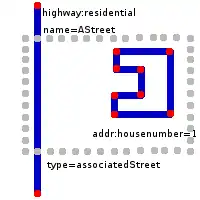 <node id="11" lat=... lon=...> <tag k="addr:housenumber" v="10" /> <tag k="addr:street" v="AStreet" /> </node> ó <relation id="??"> <tag k="type" v="associatedStreet" /> <member type="node" ref="11" role="house" /> <member type="way" ref="???" role="street" /> </relation>