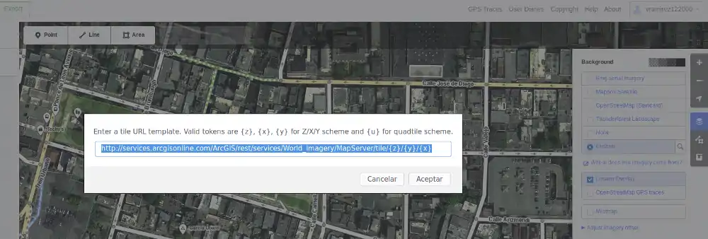IntroducciónContribuir a Open Street Maps (OSM) requiere el uso de un software de edición. El equipo de Open Street Maps de Puerto Rico (PROSMap) recomienda 2 editores, el editor básico iD y el editor más avanzado "desktop” JOSM. iD es bueno para añadir información a formas que ya existen en la plataforma y para añadir puntos pero puede ser problemático para crear formas geométricas más complejas. Además la imágenes utilizadas en el editor iD provistas por Bing está desalineadas. Paso 1: Registrarse como usuario de Open Street MapVisita la página de Registro de OSM Paso 2: Configurar Imágenes del Editor iDCon el propósito de prevenir que se dibujen objetos desalineados, se deben configurar en la cuenta de OSM las imágenes provistas por USACE 2010 en el editor iD. El siguiente “screenshot” muestra como cambiar y configurar las imágenes en la plataforma. Nuevas imágenes 2013 para San Juan, Guaynabo and Catañohttp://imagery-pr-usace-2013.s3-website-us-east-1.amazonaws.com/tiles/{zoom}/{x}/{y}.jpg