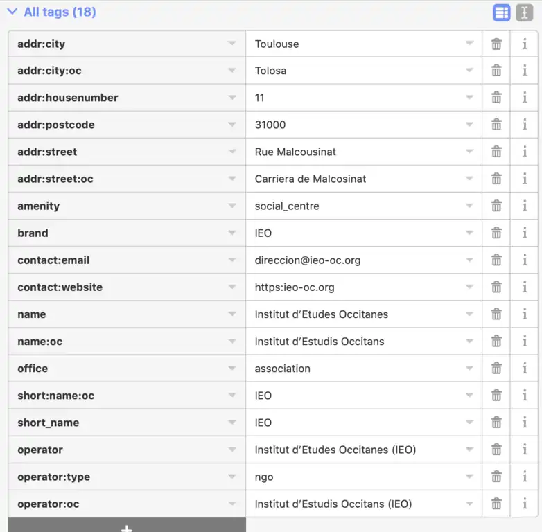 - association=*: según la práctica de OpenStreetMap, esto podría usarse para indicar el tipo de asociación. Buenos valores observados: association=religious, association=music, association=sport, association=cultural, association=journalism. Malos valores observados: association=non_profit (usa office=ngo en su lugar), nombre concreto de la asociación (usa name=* en su lugar). Algunos valores propuestos más: association=special_police.