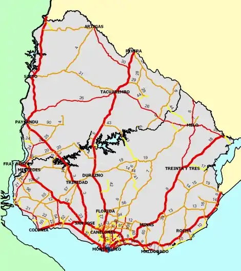- Los caminos rurales más importantes de los departamentos del interior del país (los que no son en Montevideo), deben marcarse con highway=tertiary. Esta clasificación se reserva, generalmente, para los que son asfaltados o con superficie de hormigon(Se supone que en la actualidad los caminos mas importantes y/o transitados se han mejorado con asfalto, de todas formas habria que afinar esta definicion)