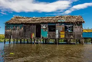 Los palafitos simplemente se dibujan como edificios, puede ir sobre el agua y/o tierra ya que puede ser inundable y se etiquetan: | stilt_house