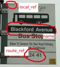 - naptan:AtcoCode: (local_ref in the picture) This is the number that is displayed on the bus stop and usually differs slightly from the AtcoCode reference See and for more info