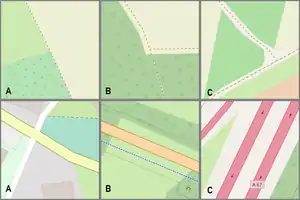 On some occasions the feature you wish to tag is not represented by a line (as is the case of a road, river, rail line etc), but by an area. For instance a wooded area, a park, or a lake are all Map features which are areas. Create a new closed way which represents the outline of the required area. Annotate this way with the required tagging from the map features page, such as natural=water (for a lake), landuse=forest (for a forest), or leisure=park (for a park), etc.