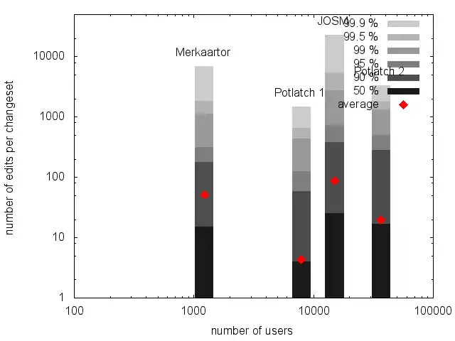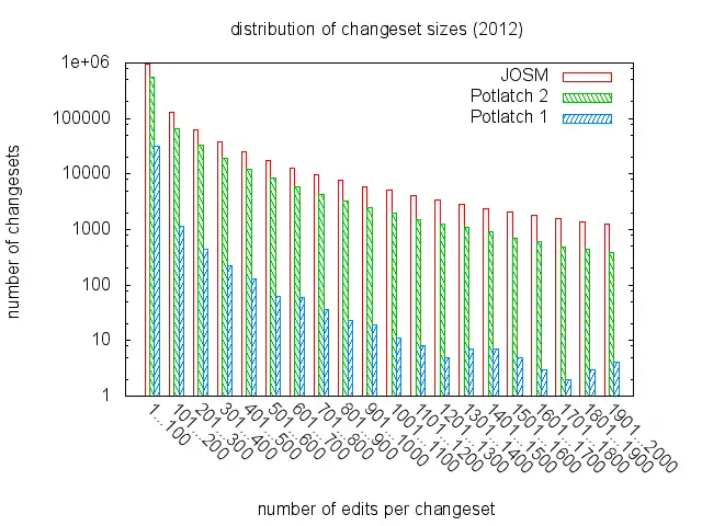 The distribution of changeset sizes is also represented in this histogram, that is, a diagram showing how many changesets exist with 1-100 edits, 101-200 edits, and so on. (Empty changesets - 0 edits - are dropped here.) Clearly Potlatch 1 is hardly ever used for making more than a few edits, while the number of changesets made with Potlatch 2 forms a nearly constant fraction of the corresponding number of changesets made with JOSM for quite a large range of changeset sizes. Only for really large changesets with more than, say, 5000 edits, this fraction drops off significantly and goes to zero around 20 000 edits (see the corresponding histogram for the full range up to 50 000 edits). Another diagram for the low end (up to 200 edits) is also available.