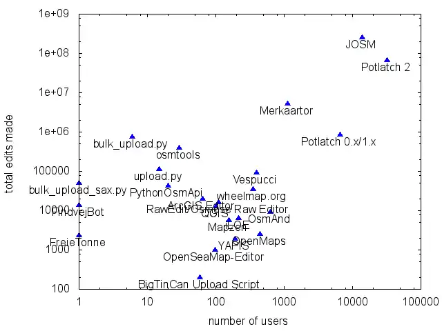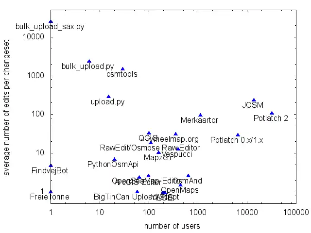 The first plot displays each editor by the number of its users and the total edits made using it, which may be interpreted as the editor's total impact on the OSM database. The distribution of editors across the plot is roughly diagonal: There is a mainstream region in the upper right, where editors have a large user basis and are used to create or modify large amounts of data: JOSM, Potlatch 2 and - to a lesser extent - Merkaartor and Potlatch 1. All other editors are used by relatively few mappers (down to just one), and consequently, relatively few edits are made with them. Only a few specialized tools for large-scale edits appear somewhat off-diagonal.