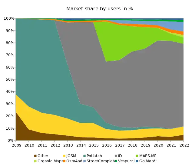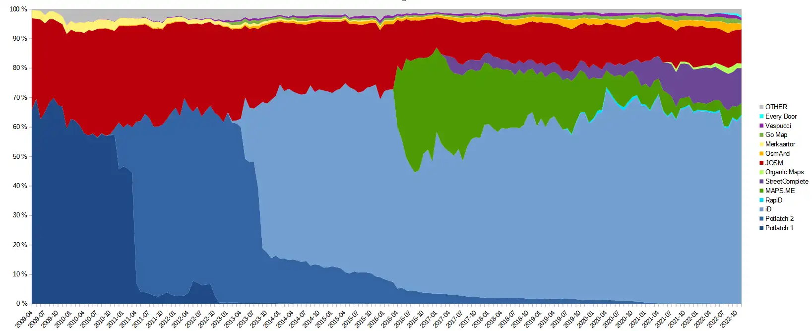 | StreetComplete | - | - | - | - | - | - | - | 7 (~0%) | 9 572 (3.0%) | 9 764 (3.2%) | 8 966 (3.2%) | 11 695 (3.9%) | 21 935 (7.5%) | 23 525 (9.1%) |
