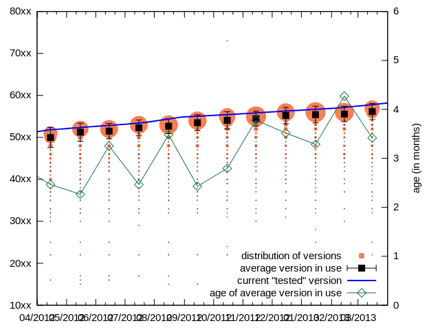 How regularly do JOSM users update their editor? This plot shows the JOSM versions in use in a given month, weighted by the number of changesets and clustered by the version number's leading digits. The majority of users clearly keeps their JOSM largely up-to-date, working with at least a recent "tested" release - commercial software manufacturers must envy the JOSM developers. The average version in use is roughly three months behind the current release; however, also very old versions are still being used by a small but nonvanishing and apparently die-hard number of mappers. Even the ancient release 1566 from May, 2009 is still seen occasionally.