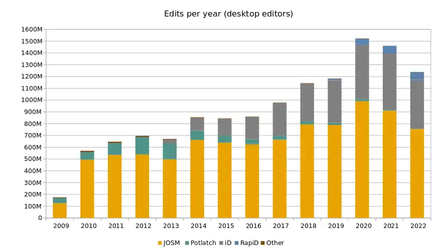 | JOSM | 125 615 526 (20.8%) | 494 458 142 (77.4%) | 535 571 793 (80.0%) | 538 991 252 (73.5%) | 497 722 412 (70.7%) | 662 069 355 (76.2%) | 638 906 360 (73.9%) | 624 851 125 (70.8%) | 664 025 865 (67.1%) | 794 007 605 (68.4%) | 788 357 489 (63.9%) | 990 855 817 (63.6%) | 910 154 197 (59.1%) | 754 127 036 (58.6%) |