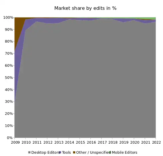 - Most other editors have never reached percent-level market shares (the exceptions being import scripts, used by only few users but editing large amounts of data).
