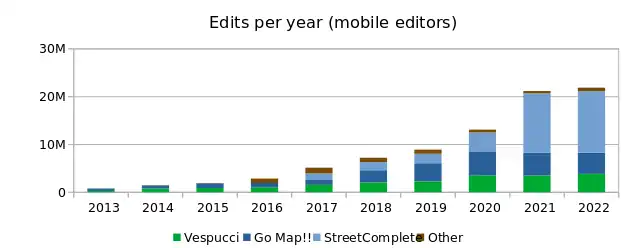 - Recently, several smartphone applications have obtained a non-negligible audience (making very few actual edits per changesets, which of course reflects their goal of filling the niche for quickly editing, like entering the opening hours of some POI). These include StreetComplete, Go Map!!, Vespucci, Pushpin, POI+, and the navigation tools OsmAnd, MAPS.ME, Organic Maps.