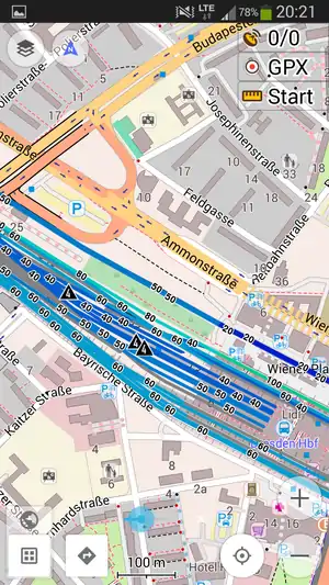 - Die Railway Maxspeed Map zeigt zulässige Geschwindigkeiten farblich an.