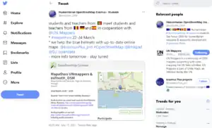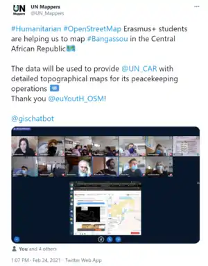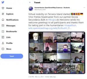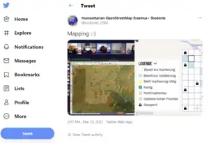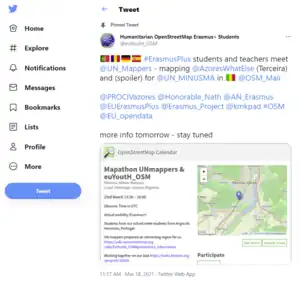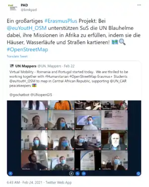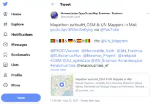 "A great, sustainable Erasmus+ project: Humanitarian OpenStreetMap Erasmus+ @euYoutH_OSM" a Tweet by the German National Agency