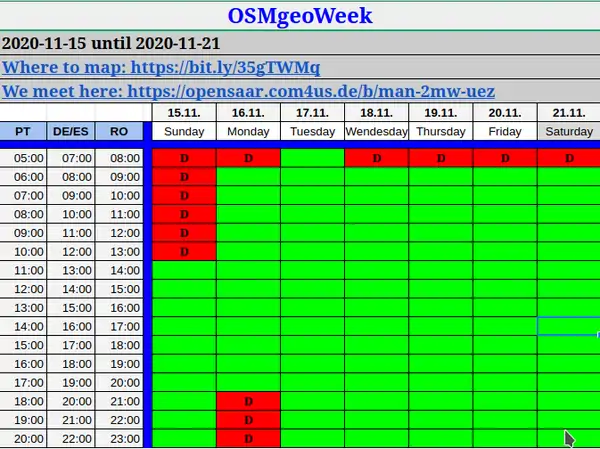 | DE | Project Management Spreadsheet, JOSM Training, QA-Editor, uMap, Overpass, OSMBC |